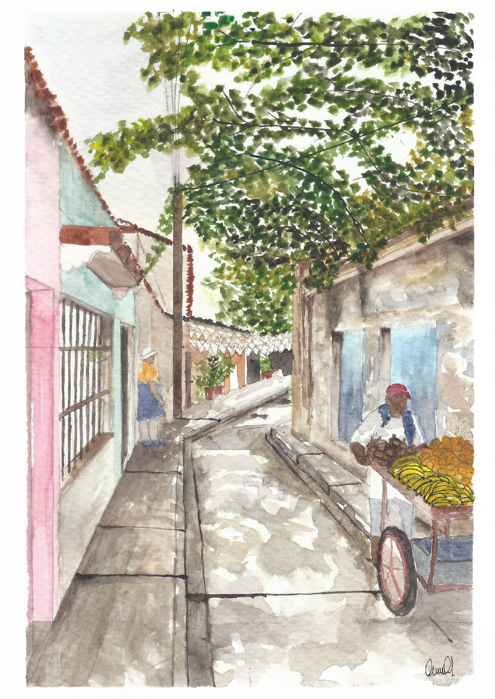 Esta obra es una secuencia de 12 pinturas que conforman un recorrido urbano por la ciudad de Cartagena de Indias en Colombia. En cada una de las pinturas se registra el recorrido que hace un vendedor de frutas por esta maravillosa ciudad hasta que finalmente frena para concretar una venta.